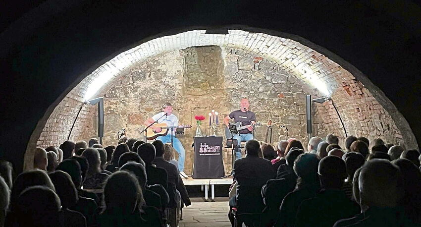 Große Gefühle, lustiges Kopfkino, Austropop und Eigenkompositionen hat das Duo „Zwoa Achterl – bitte“ beim Konzert im Wiesenter Sommerkeller präsentiert. Rainer Kapalla und Roland Winkler traten dabei mit dem Programm „Überdosis Glück“ auf. Dabei wurden in einer gemütlichen Wohnzimmeratmosphäre die Lachmuskeln des Publikums strapaziert.
